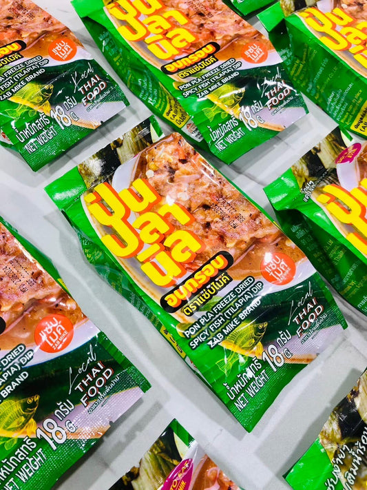 น้ำพริกป่นปลานิล อบกรอบ ตราแซ่บไมค์ (PON PLA FREEZE DRIED SPICY FISH(TILAPIA) DIP ZAB MIKE BRAND)